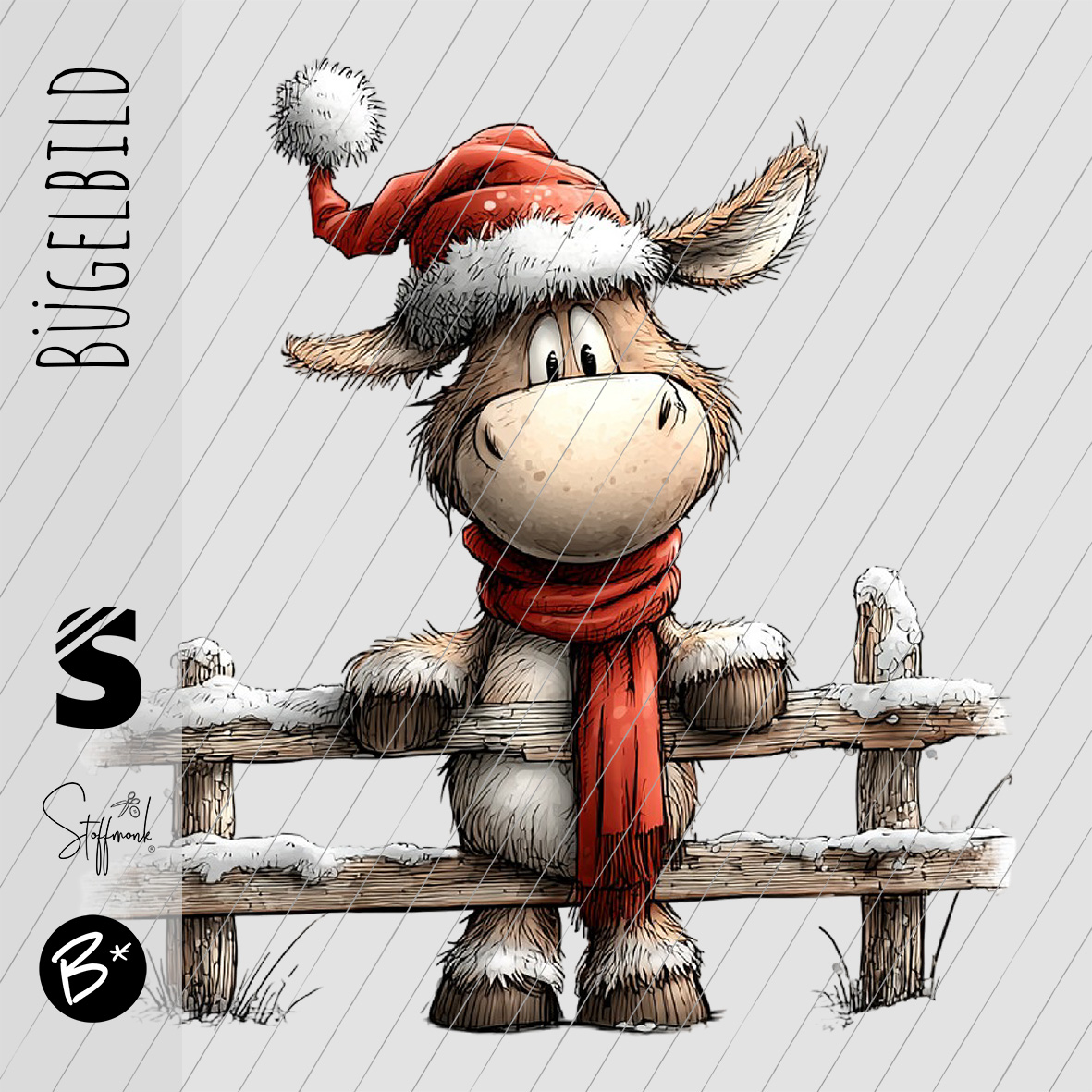 Bügelbild - " Kuh am Zaun mit Mütze & Schal "