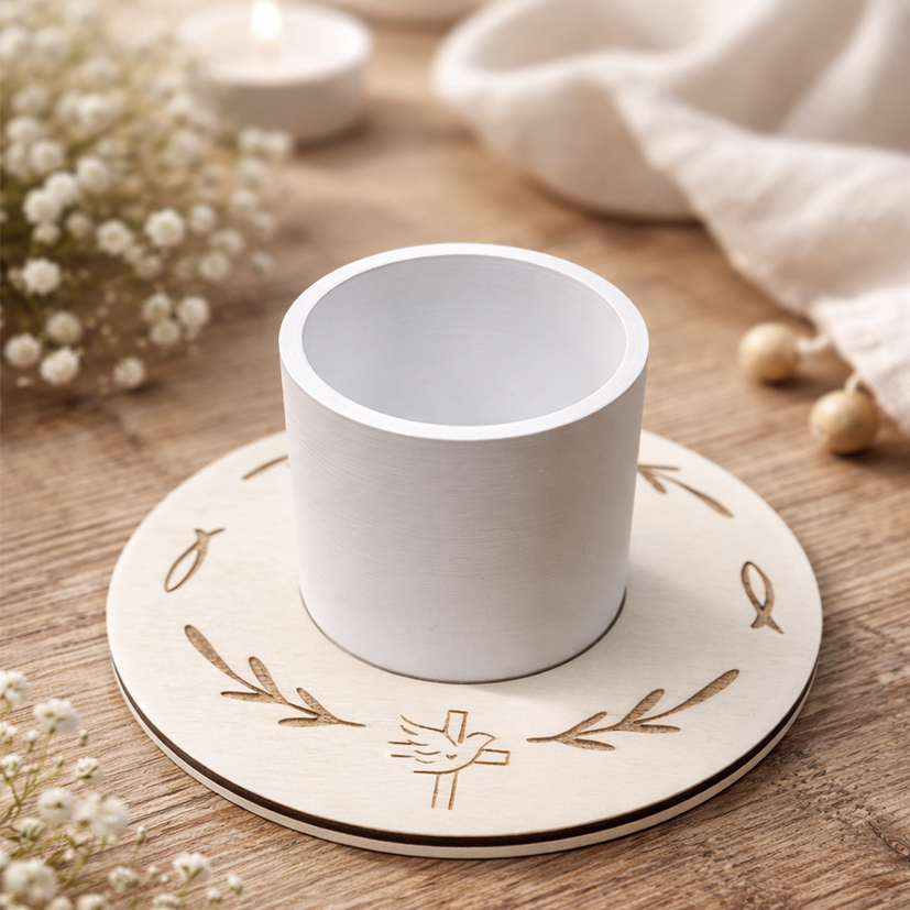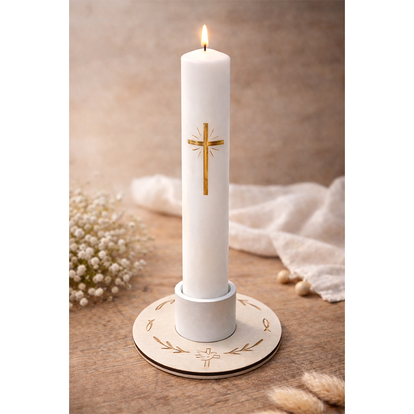 Kerzenhalter Kommunion #weiss ~ optional mit Kerzenring aus Holz ( Zweige/Fische/Taube)