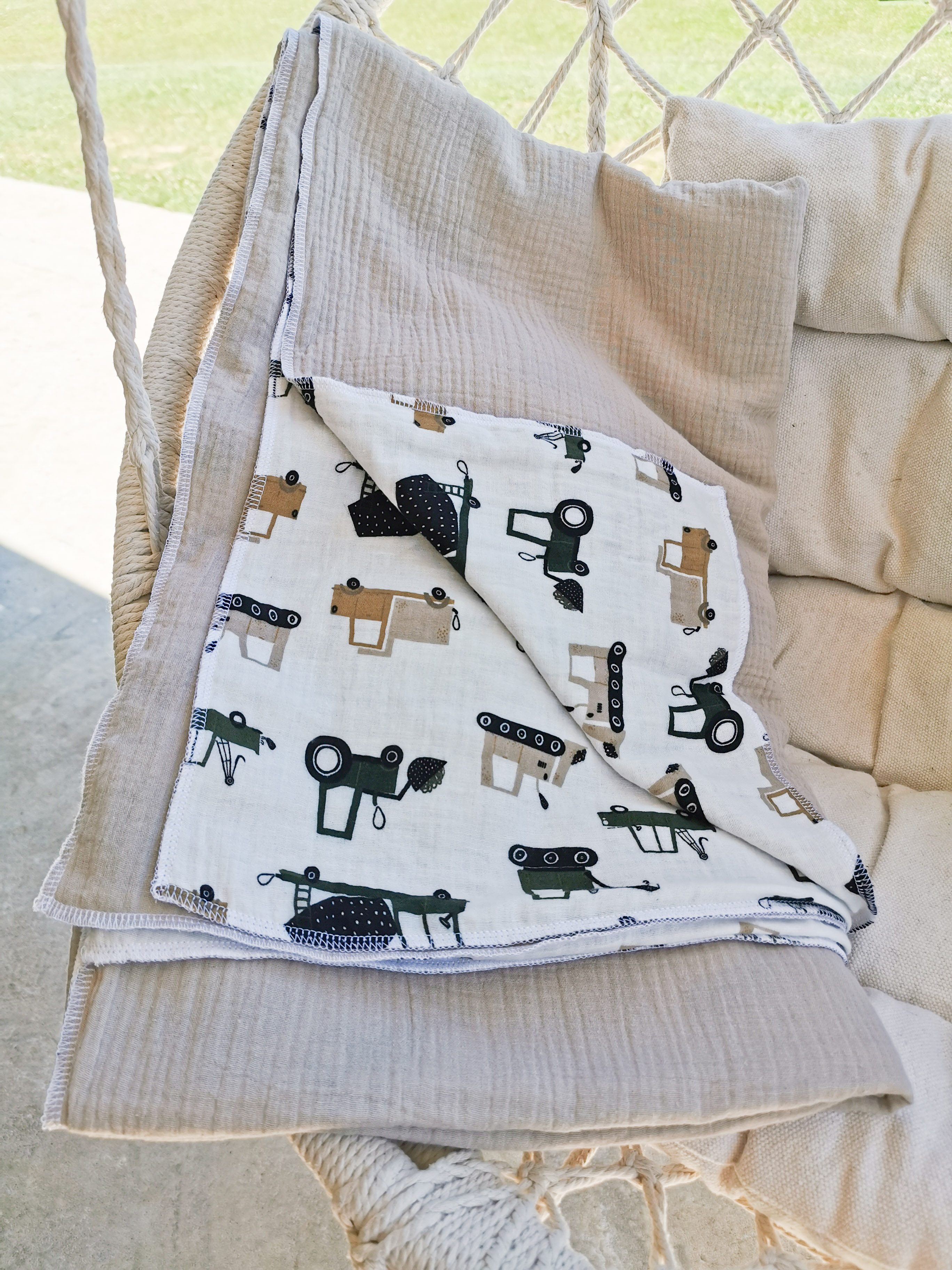 Musselin Double Gauze - Baustellen Trucks - Grün Beige
